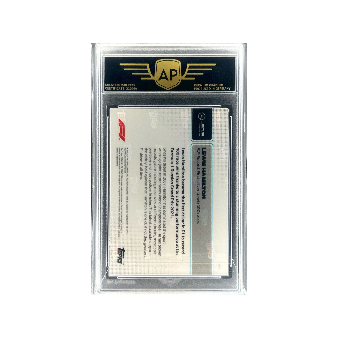 Táto AP Mint+ 9.5 karta je ikonickým zberateľským kúskom, ktorý oslavuje Hamiltonovu veľkolepú kariéru a historický míľnik, ktorý si bude motoršport pamätať navždy.