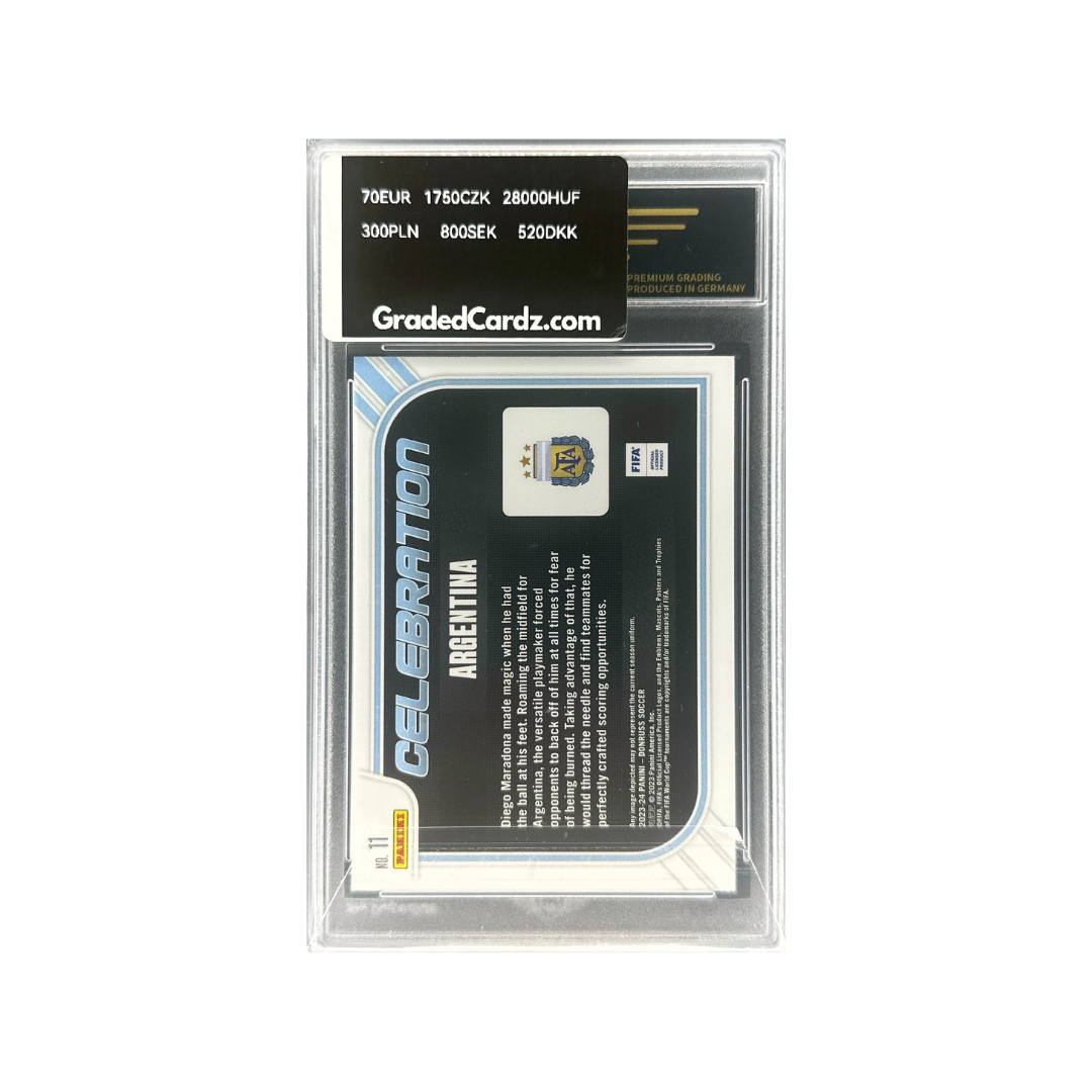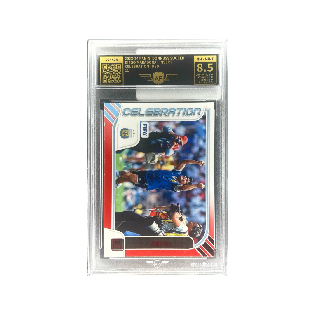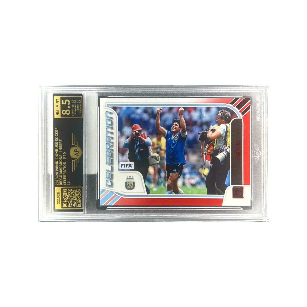 Táto zberateľská karta z edície 2023-24 Panini Donruss Soccer vzdáva poctu jednej z najikonickejších futbalových osobností histórie — Diegovi Maradonovi. Insert Celebration zachytáva autentický okamih radosti a emócií, ktorý preslávil nielen hráča, ale aj celú Argentínu. Paralelná verzia Red zvýrazňuje dizajn a pridáva karte dynamický kontrast.