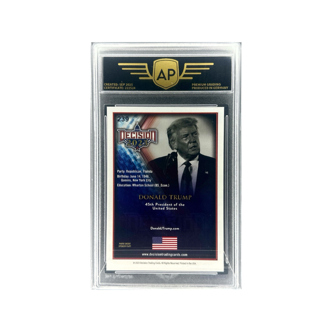 Karta zo série Decision 2023 zachytáva Donalda Trumpa v ikonickom prezentačnom momente. Séria Decision je známa svojím politickým a spoločenským tematickým zameraním, pričom ide o obľúbenú kolekciu medzi zberateľmi moderných historických a politických kariet. Hodnotenie AP 9.5 Mint+ spolu s dokonalými rohmi a hranami (10/10) potvrdzuje mimoriadny stav tohto exemplára.