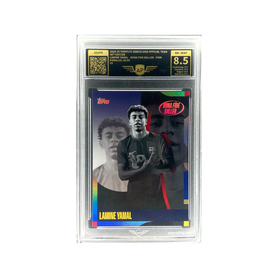 Táto limitovaná karta Lamineho Yamala zo série 2024-25 FC Barcelona Team Set predstavuje mladú megahviezdu európskeho futbalu v dizajnovom spracovaní Bona Fide Baller, ktoré zvýrazňuje jeho výnimočný talent a rýchlo rastúci status v klube aj na medzinárodnej scéne. Paralelná verzia Pink je limitovaná len na 99 kusov, pričom tento exemplár má číslo 45/99. Hodnotenie AP 8.5 NM–Mint odráža veľmi dobrý stav karty so silnými subgrades v centeringu a rohoch.